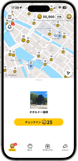 - 対象スポットに近づくとチェックインができるようになりますので、ボタンをタップします。